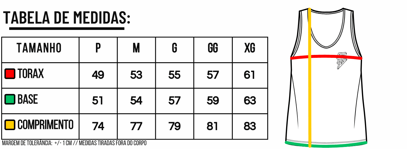 Para garantir que a regata vai te servir com exatidão, meça seu corpo com uma fita métrica e compare com nossa tabela de medidas para saber qual o tamanho ideal.